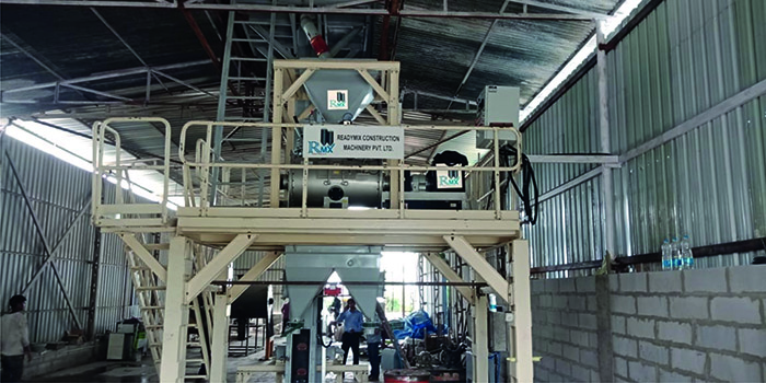 The finished goods packing and storage section– It is at the ground level of the structure. In this section, the final product batch from the mixer is automatically discharged into a discharge hopper and packed in bags by the manual packing machine.